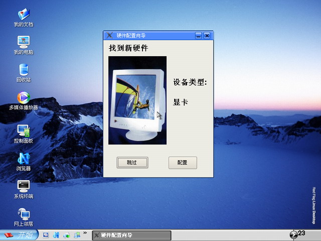 已经进入桌面了,同时弹出了硬件配置向导,还是配置一下!点击“配置”按钮,配置显卡后再配置网卡等,完成后出现如下图31所示。
